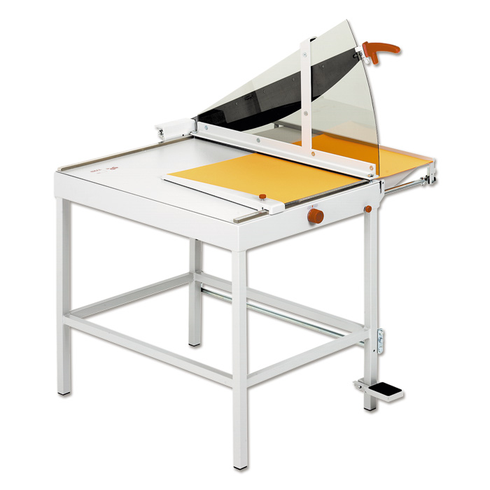 Mit den kraftvollen Schneidemaschinen mit Untergestell schneiden Sie Papier und Karton in Plakat-Größe leicht und sicher. Besonders praxisgerecht ist der abklappbare Seitentisch, er stützt das Schnittgut beim Schneiden großer Formate. Die Pressvorrichtung ist in das Untergestell integriert und wird per Fußpedal betätigt. Der extra stabile transparente Messerschutz führt das große Schneidemesser aus Solinger Stahl präzise. Der justierbare Vorderanschlag, exakte Maßskalen und die Schmalschnitt-Einrichtung erleichtern den exakten Zuschnitt. Die pulverbeschichtete Ganzmetall-Konstruktion sorgt für stabile Standfestigkeit.