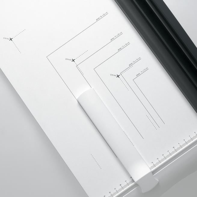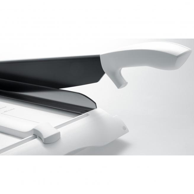 Exakte Schnitte bei Papierformaten von DIN A4 bis A6 gelingen Ihnen mithilfe des lasergeschnittenen Universalmessers. Dabei bietet die transparente Anpressschiene mit Übergriffschutz und integriertem Präzisions-Schnittandeuter eine genaue Schnittkante. Der ergonomische Griff liegt optimal in der Hand. Typische Foto- und DIN-Formate sind auf den Schneidetisch gedruckt. Vorne und hinten bietet die Schneidemaschine zwei Papieranlagen und 2 Skalen mit Angaben in cm und mm. Den Rückanschlag können Sie auf der vorderen sowie der hinteren Papieranlage platzieren. Messer und Schnittschiene bestehen aus Spezialstahl mit Antihaftbeschichtung.