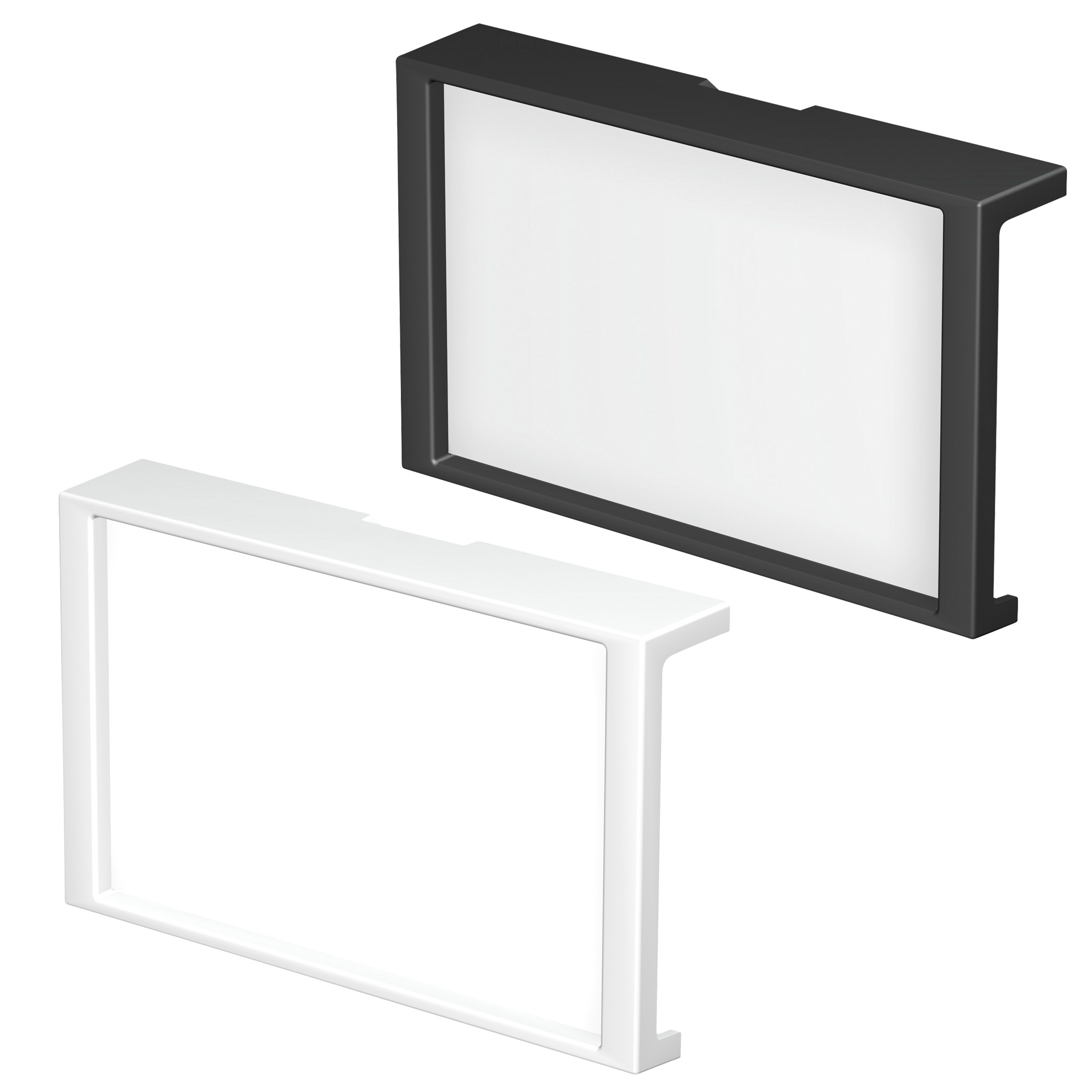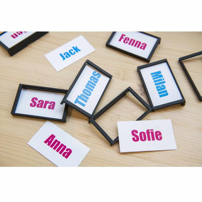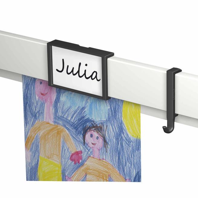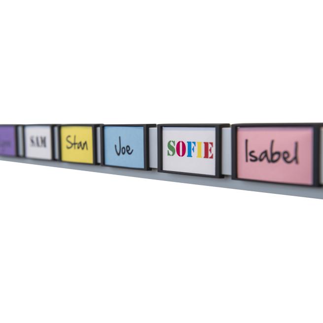 Optimale Ergänzung für das Info Rail Wandleistensystem. Das Schild mit weißem oder schwarzem Rahmen klicken Sie einfach auf Ihre Info Rail Wandleiste. Kennzeichnen Sie auf dem Schild z. B. Projektnamen oder Kindernamen. Einfach auf Papier schreiben und das Stück Papier dann hinter die transparente Folie des Schilds legen und an der passenden Stelle auf der Wandleiste platzieren. Wiederverwendbar.