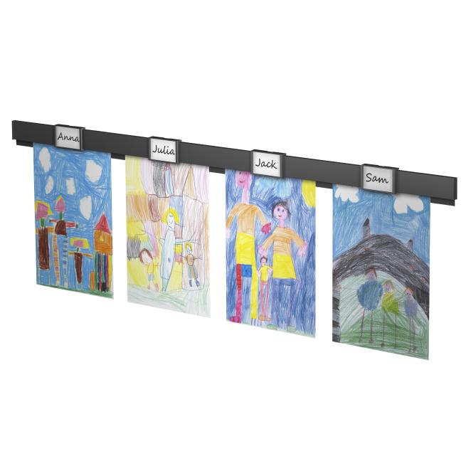 Die schwarze, ein Meter lange Info-Rail Wandleiste kann mit zahlreichem Zubehör ausgestattet werden. An ihr präsentieren Sie Fotos, Karten, Lernmaterial, etc. schnell und ansprechend. Papier mit einer Grammatur von 80 g/m² oder auch Karton bis zu einer Stärke von 2 mm schieben Sie leicht in die 2-fache Gummieinspannung in der Schiene. Die Wandleiste befestigen Sie mit dem Montagematerial fix an der Wand auf den beiliegenden Verbindungsclips.