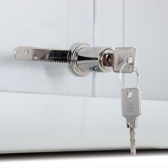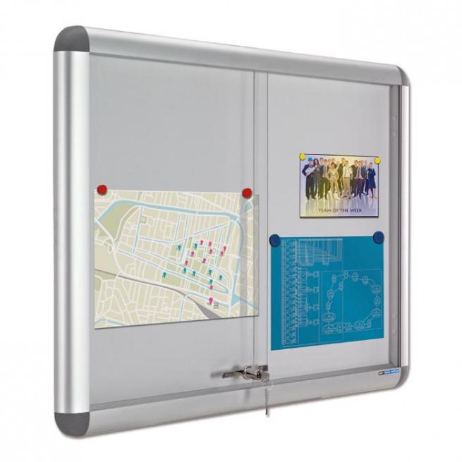 Auch diese Vitrine ist abschließbar. Auf der weißen Rückwand der Vitrine haften Magnete fest. Der Aluminium-Rahmen mit Kunststoff-Ecken ist widerstandsfähig und leicht sauber zu halten.