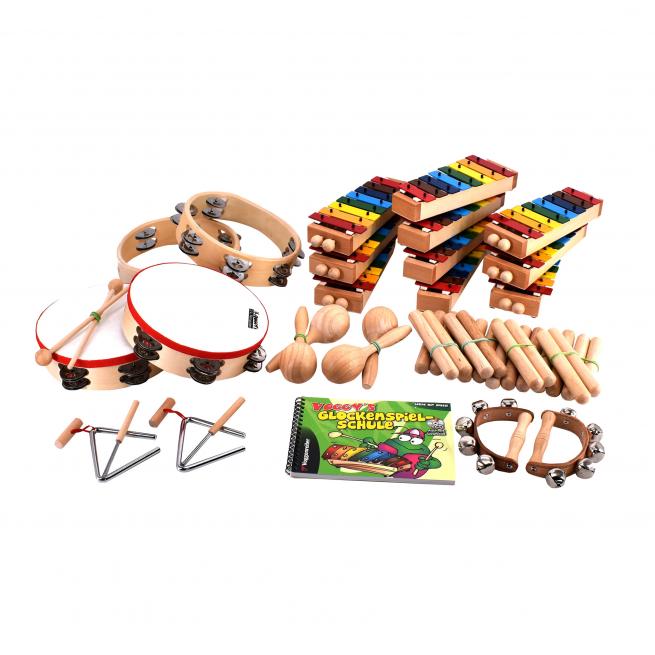 Glockenspiele und Percussion-Instrumente: Die Kombination in der praktischen Aufbewahrungsbox ist die optimale Grundausstattung für Ihren Kindergarten. Das diatonisch gestimmte Glockenspiel von C bis C ist ein echtes Klangwunder. Die unterschiedlichen Klangplattenfarben unterstützen das direkte Mitspielen nach Farben und das Notenlernen. Das beiliegende Buch Glockenspielschule hält viele praktische Übungen und bekannte Kinderlieder mit Noten, auch zum direkten Mitspielen nach Farben, bereit. Für 10 Kinder ab 3 Jahren.