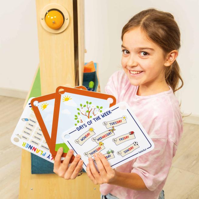 3 Lern-Karten zum anpluggen, beidseitig bedruckt: Schwungübungen, Stundenplan, Entwicklung (Apfel: von der Blüte bis zur Frucht/Schmetterling: vom Ei bis zum Falter)