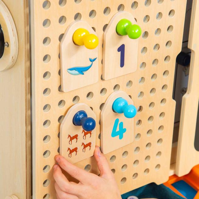 10 Holzkarten zum Anhängen an die Plugs, beidseitig bedruckt: Formen erkennen: 5 geometrische Formen und 5 dazu passende Gegenstände, Erstes Zählen: Zahlen und dazu passende Mengen für 1-5