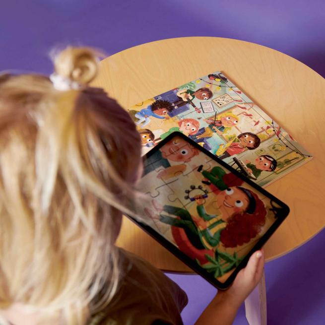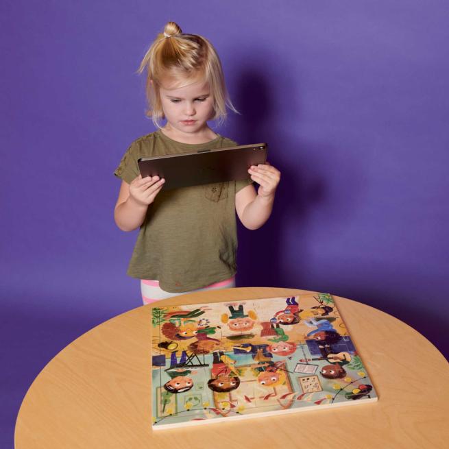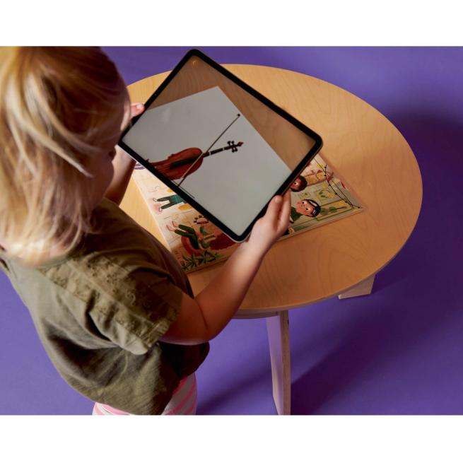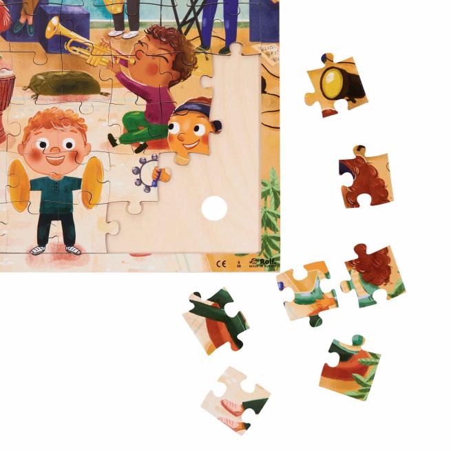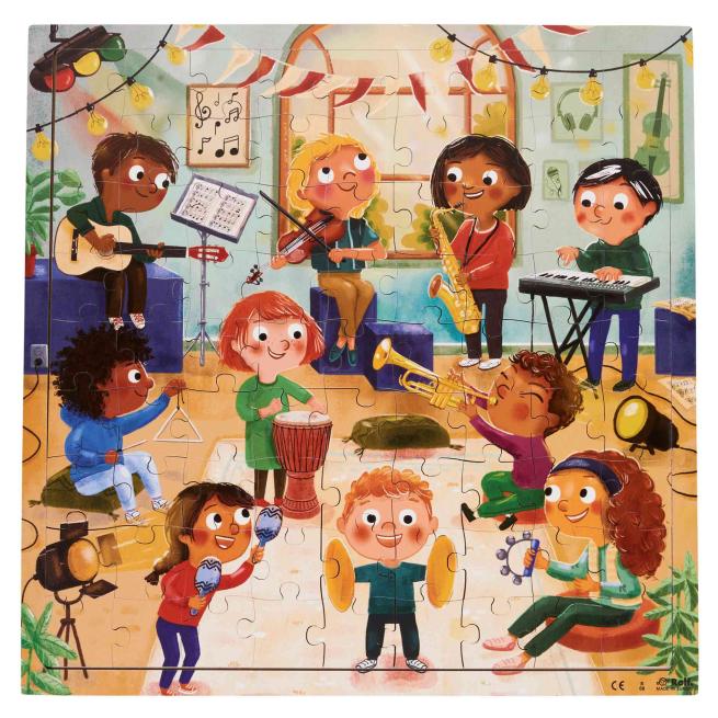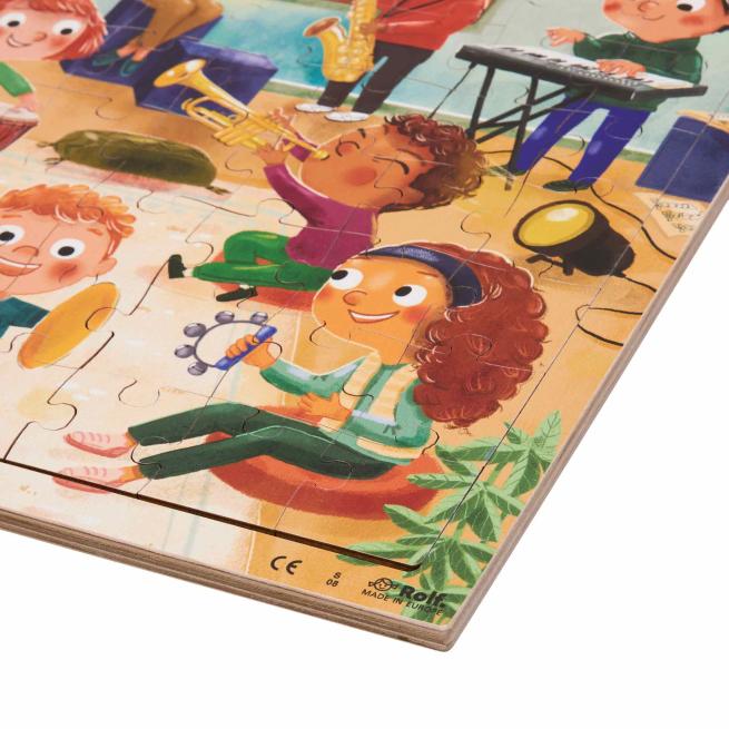 Die Kombination von klassischem Spielzeug mit Technik macht das Puzzle zu einem cleveren Lerntool. Wie Keyboard, Gitarre, Djembe, Violine, Saxophon, Trompete, Maracas, Triangel, Glockenspiel und Becken klingen, finden Ihre Kinder mit dem interaktiven Puzzle spielend heraus. Auf dem Holzrahmen puzzeln sie die 81 Teile zusammen. Aus den gängigen Stores laden Sie die dazugehörige App „Rolf Sounds“ auf ihr Smartphone oder Tablet. Nachdem Sie die App installiert und aufgerufen haben, scannen Sie mit den Kindern einfach die einzelnen Instrumente auf den entsprechenden Puzzleteilen ab. Daraufhin erklingt sowohl der jeweilige Klang und es erscheint ein Bild des Instruments auf dem Endgerät. So bekommen die Kinder eine direkte Vorstellung von dem entsprechenden Instrument. Durch das Puzzeln trainieren sie ihre Feinmotorik und ihr Kombinationsvermögen. Haben Sie im Puzzle das Bild mit den Noten an der Wand entdeckt? Scannen Sie es mal gemeinsam mit Ihren Kindern und erleben Sie eine klangvolle Überraschung mehrerer Instrumente.