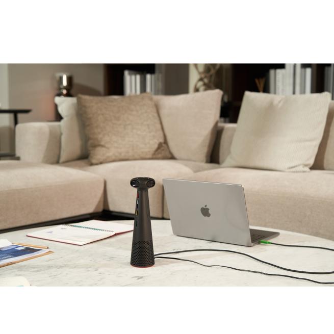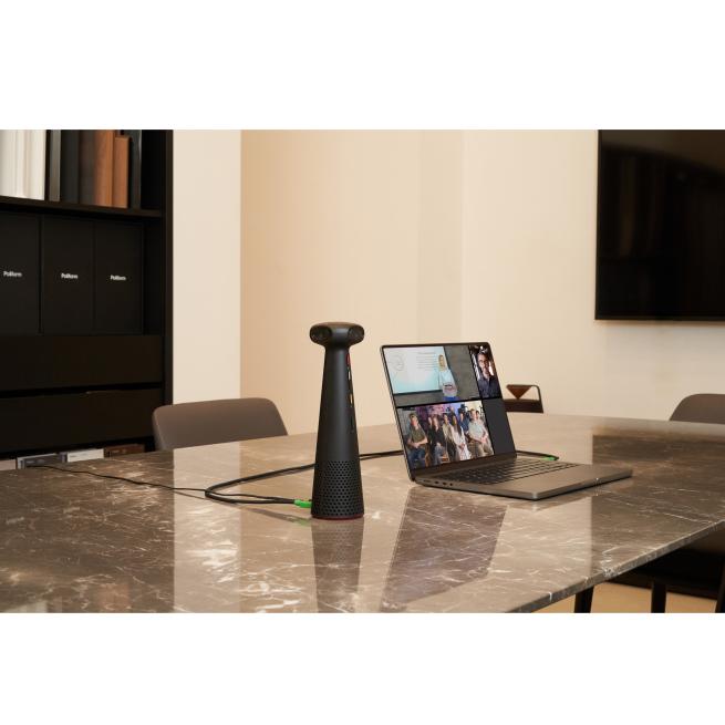Der Konferenzmodus bietet eine 360°-Ansicht des Tisches, an dem die Teilnehmenden sitzen. Bis zu vier Sprecher können dabei in individuellen Nahaufnahmen hervorgehoben werden.