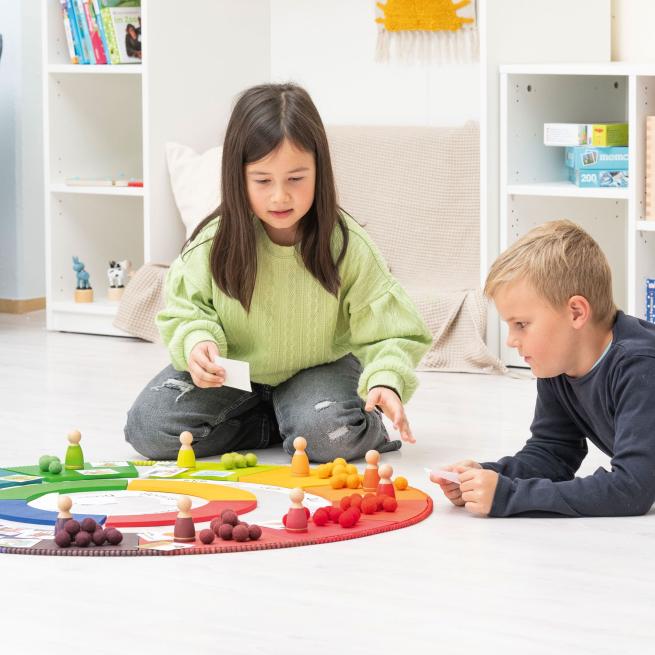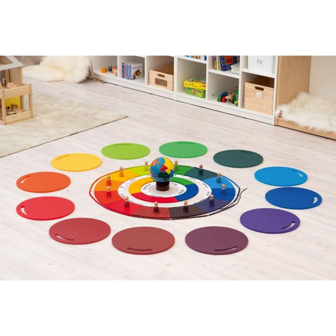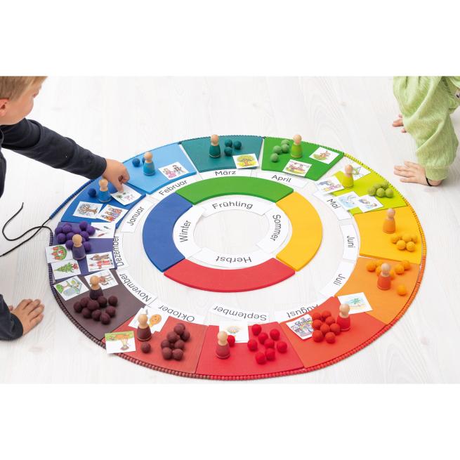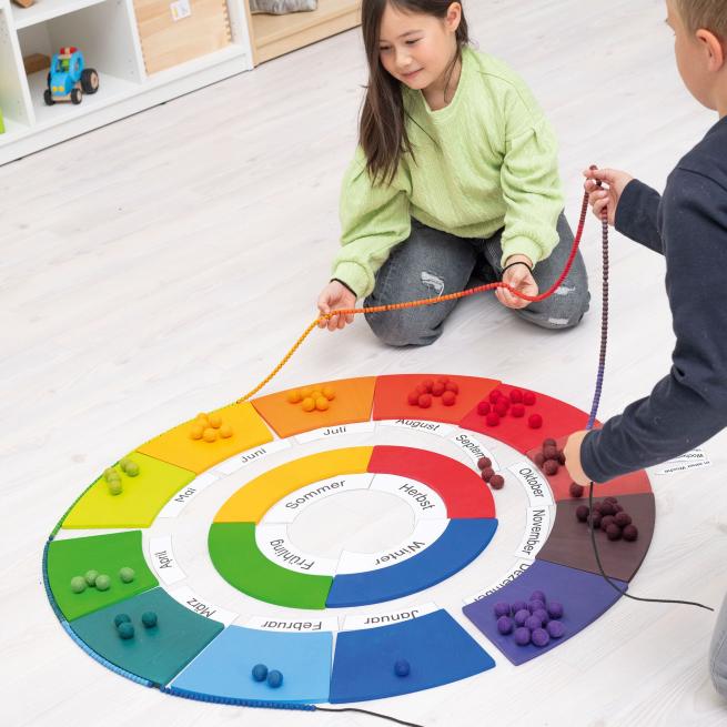 In welcher Jahreszeit beginnt die Natur zu erblühen und in welchem Monat kommt eigentlich das Christkind? Anhand des Jahreskreises entdecken Sie mit Ihren Kindern anschaulich Jahreszeiten und Monate. Der kleinere Kreis, bestehend aus je einem gelben, grünen, roten und blauen Element symbolisiert die Jahreszeiten. Die 12 Holzelemente des großen Kreises stehen für die jeweiligen Monate. Dabei repräsentieren auch die unterschiedlichen Farben des Lernmaterials nach Montessori die Jahreszeiten und Monate. Darüber hinaus nutzen die Kinder die 16 Holzteile auch zum Bauen und Konstruieren. Die 12 Teile des großen Kreises eignen sich auch bestens zum Erkunden der Uhrzeit.