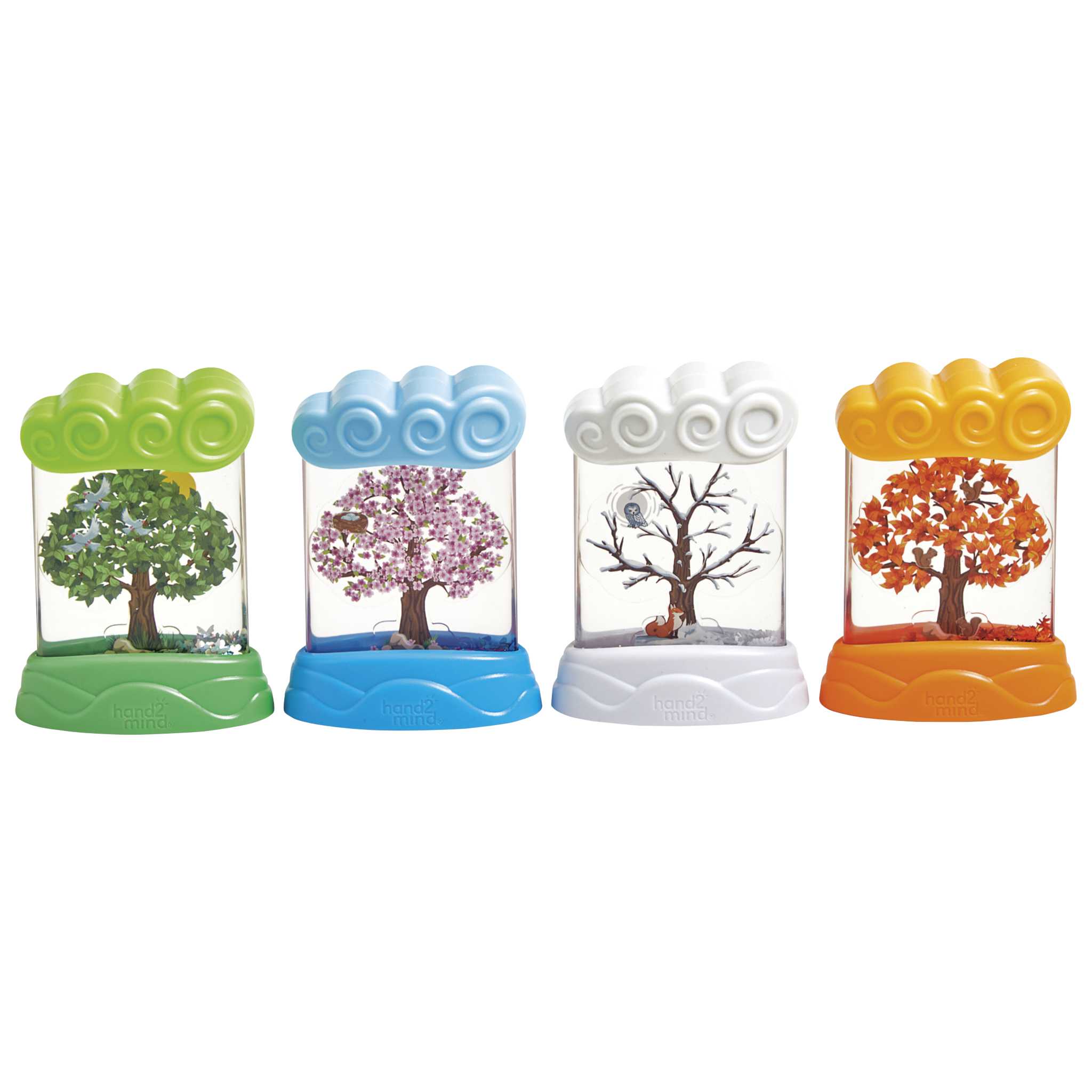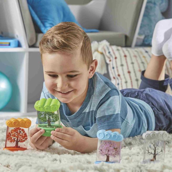 Die 4 Jahreszeiten-Entdecker-Röhren zeigen einen Baum und seine tierischen Bewohner im Wechsel von Frühling, Sommer, Herbst und Winter. Die griffigen Behälter funktionieren ähnlich wie Schneekugeln: Schütteln die Kinder die Röhrchen, verwirbeln sie je nach dargestellter Jahreszeit bunte Blüten, glitzernde Schmetterlinge, fallende Herbstblätter oder weiße Schneeflocken. Dabei entdecken die Kinder viele weitere jahreszeittypische Details, wie ein Vogelnest, Eichhörnchen auf Nahrungssuche oder eine wachsame Schneeeule.
