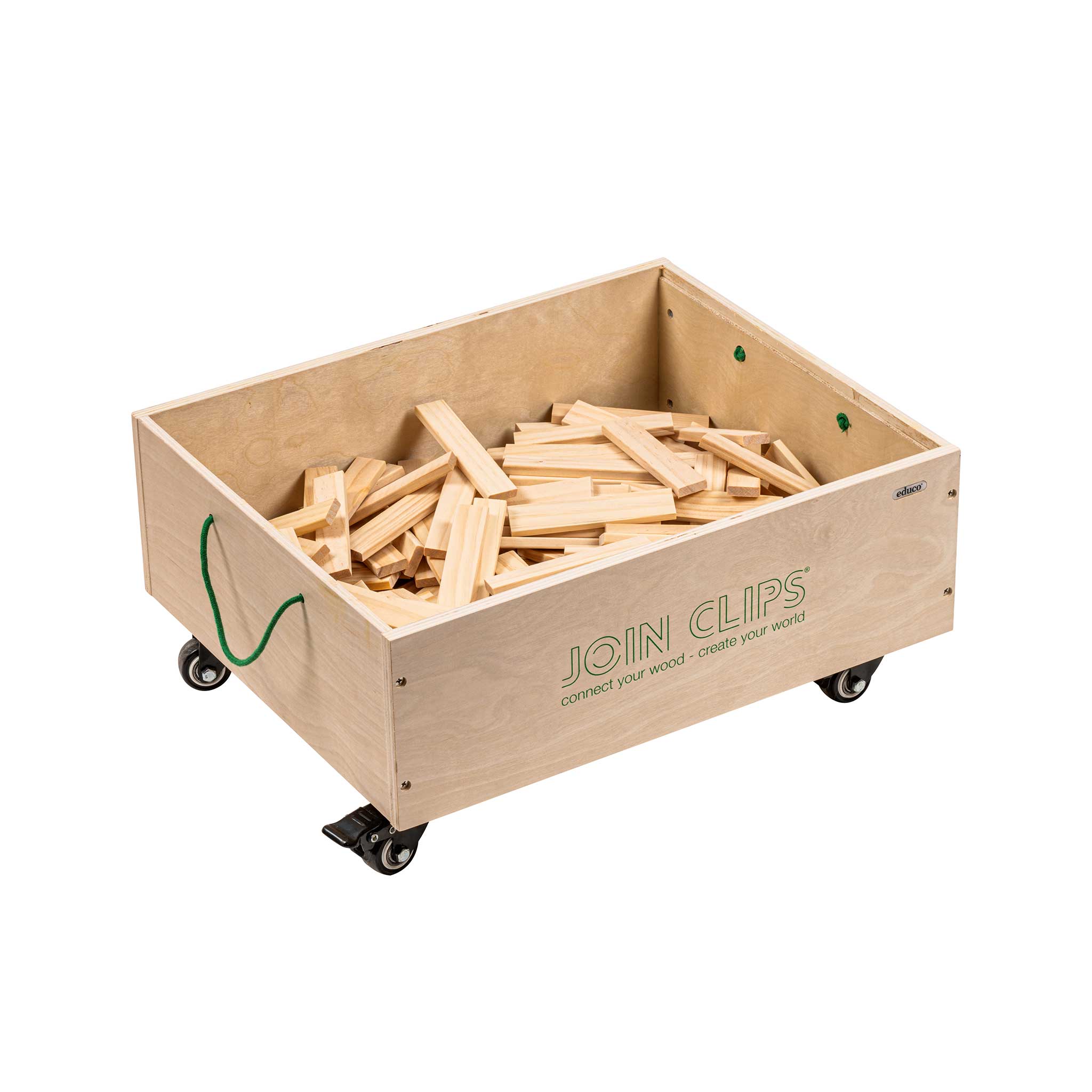 300 Baubrettchen in 3 Größen. Damit trainieren Ihre Kinder nicht nur beim Stapeln riesiger Türme ihr Geschick. Zusammen mit den JOIN CLIPS® (nicht enthalten, bitte separat bestellen) kreieren sie z. B. Autos, Häuser, LKW und noch viel mehr. Die unterschiedlichen Clip-Verbinder machen es möglich. Mithilfe der Brettchen in drei Größen bauen die Kinder detailreiche Konstruktionen. Die Brettchen bewahren Sie in der praktischen Holzkiste mit grünen Kordeln und Rollen auf. Alle JOIN-CLIPS-Boxen sind stapelbar. Sämtliche Holzteile bestehen aus zertifiziertem Holz. Auch passend für andere Baubrettchen (Stärke ± 7,9 mm) wie KAPLA®. Ab 4 Jahren.
