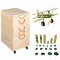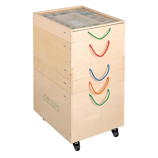 Fantasie- und Geschicklichkeitstraining in fünf Boxen. Ob Freispiel oder Zusammenbau nach Themenvorgabe z. B. im Rahmen eines Projekttages: Die Kinder überlegen sich Konstrukt sowie Bauplan und setzen es mit den Verbinder-Clips, Baubrettchen, der Murmelbahn, Bauplatten und Rädern zusammen. Dabei fördern sie spielerisch ihr Vorstellungsvermögen, das räumliche Denken und die Motorik. Alle Boxen sind stapelbar. Die Kordeln in Grün, Orange, Blau und Rot stehen für die unterschiedlichen Inhalte der Boxen. Dank der leichtgängigen Rollen unter der Baubrettchen-Box transportieren Sie das Konstruktionssystem leicht von A nach B. Zwei feststellbare Rollen geben festen Stand. Sämtliche Holzteile bestehen aus zertifiziertem Holz. Auch passend für andere Baubrettchen (Stärke ± 7,9 mm) wie KAPLA®. Altersempfehlung: ab 4 Jahren.