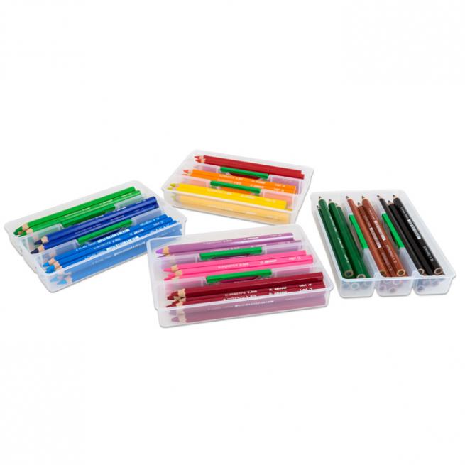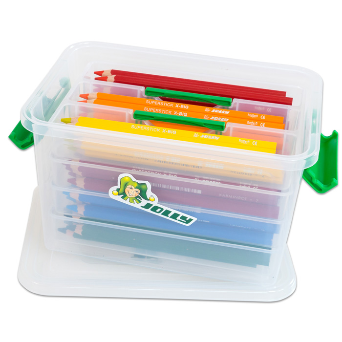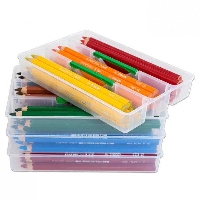 Jeweils 8 bruchsichere Stifte in 12 gut deckenden Farben befinden sich in der praktischen Aufbewahrungsbox mit herausnehmbaren Fächerschalen und Deckel.