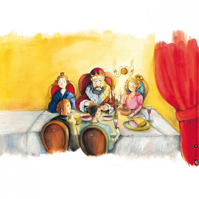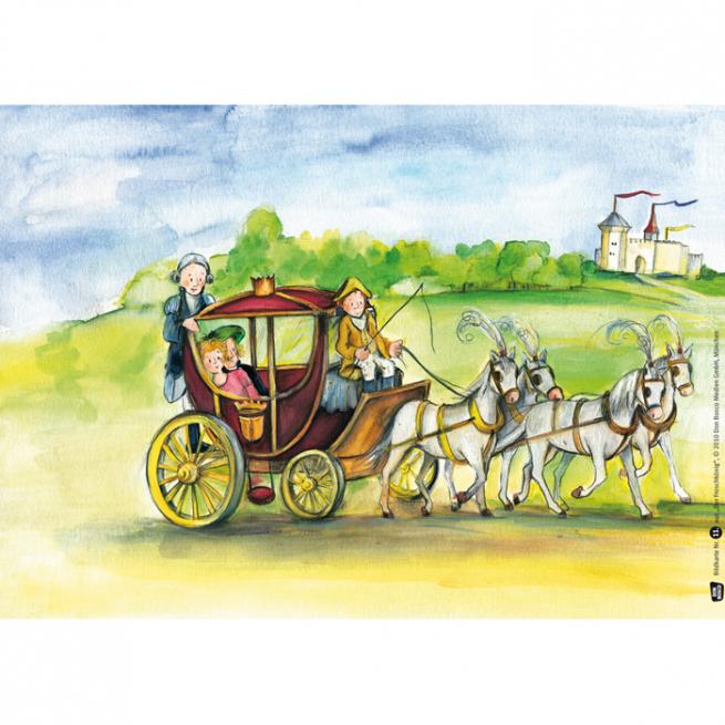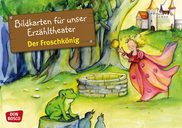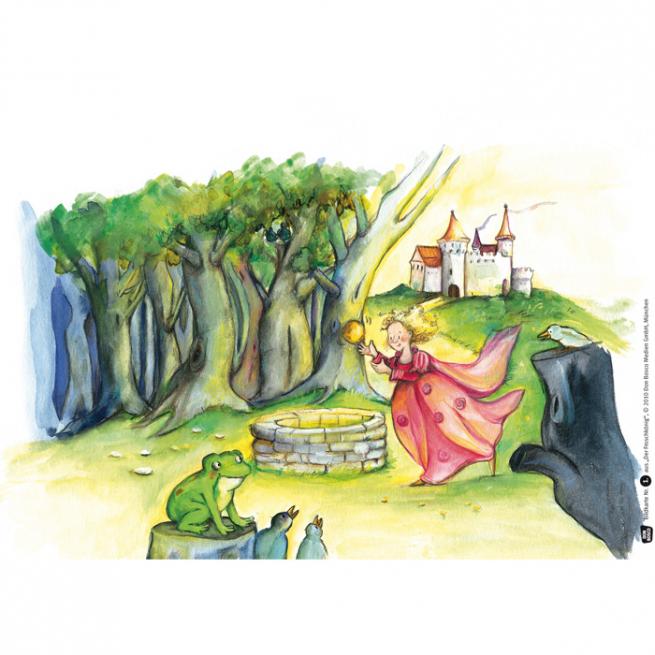 Bildkarte für Bildkarte erleben die Zuhörer, wie die Prinzessin ihr Lieblingsspielzeug, eine goldene Kugel, beim Spielen in den Brunnen fallen lässt und wie sie einem Frosch, der ihr helfen kann, die Kugel zurückzuholen, verspricht, seine Spielkameradin zu werden und Tisch und Bett mit ihm zu teilen.