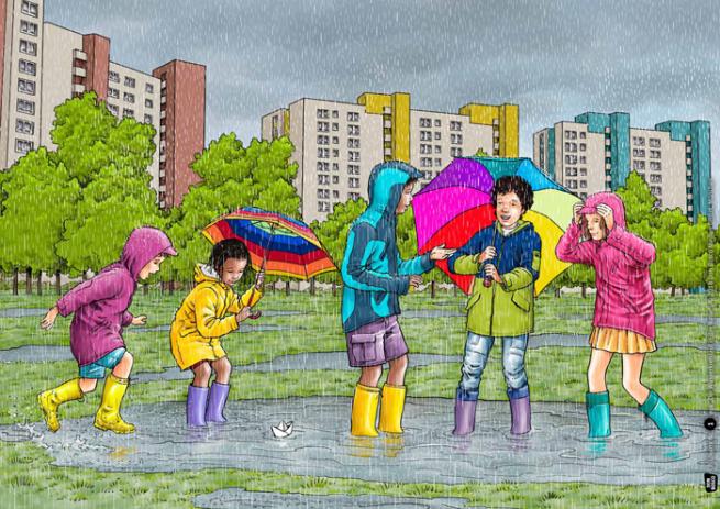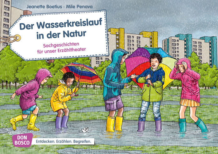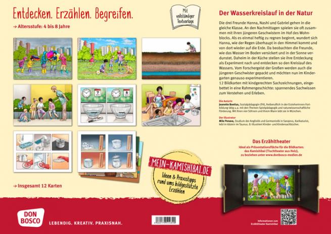 Als es plötzlich heftig beginnt zu regnen, fragt Hannas kleine Schwester, die noch in den Kindergarten geht, wie der Regen überhaupt in den Himmel kommt und von dort wieder zurück auf die Erde. Dieser Frage will Hanna gemeinsam mit ihren Freunden Nashi und Gabriel auf den Grund gehen. Schließlich sind sie schon große Schulkinder und wollen alles ganz genau wissen. Draußen beobachten sie wie das Regenwasser im Boden versickert und dann in der Sonne verdunstet. Zuhause in der Küche stellen sie diese Entdeckung als Experiment nach. Wie sie dabei den Kreislauf des Wassers entdecken, erfahren die Kinder mit jeder dieser Bildkarten für das Kamishibai. Kindgerechtes Sachwissen zum Verstehen und Erleben mithilfe des Erzähltheaters.