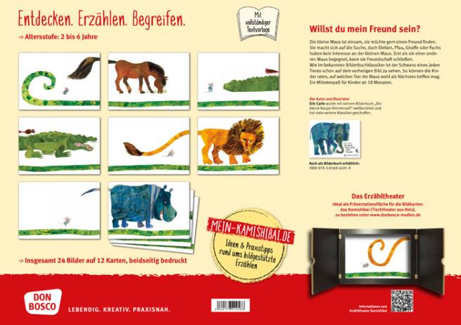 Nein!, scheint die einzige Antwort zu sein, die die kleine Maus auf der Suche nach einem Freund bekommt. Sämtliche Tiere fragt sie, doch niemand möchte mit der kleinen Maus befreundet sein. Welche Tiere sie so gemein ablehnen, erraten die Kinder mit jeder neuen Bildkarte zur rührenden Geschichte von Eric Carle. Wie es der kleinen Maus schließlich gelingt, endlich einen Freund zu finden und wieder glücklich zu sein, erfahren die Kinder im Kamishibai.