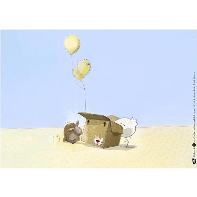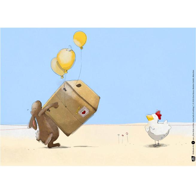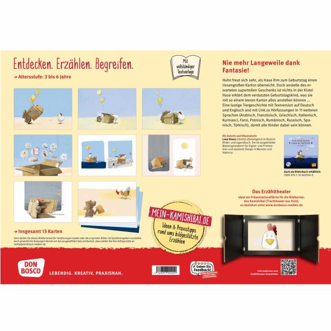 „Ein leerer Karton?“, wundert sich Huhn, als die erste große Freude über die große Box mit den drei daran befestigten Luftballons nach dem Hineinschauen schnell verflogen ist. Zum Geburtstag hatte sich Huhn eigentlich etwas ganz anderes von seinem Freund Hase gewünscht. Wie großartig dieses vermeintliche Nicht-Geschenk tatsächlich ist und was die Fantasie damit zu hat, erklärt Hase nicht nur Huhn, sondern auch Ihren Kindern im Erzähltheater Kamishibai.