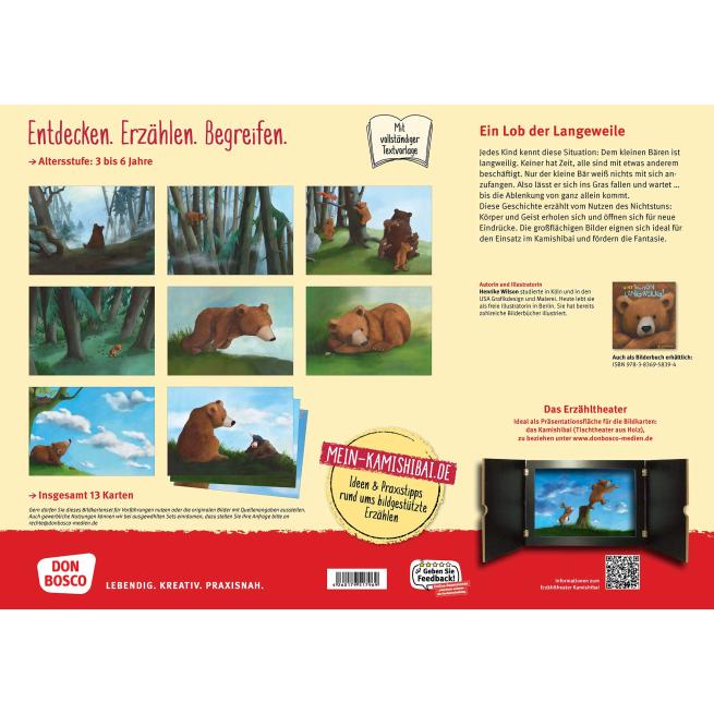 Puh, ist mir langweilig, denkt sich der kleine Bär und macht sich im Wald auf die Suche nach einem Spielgefährten. Als er feststellt, dass niemand für ihn Zeit hat, bleibt ihm nichts anderes übrig, als sich allein zu beschäftigen. Was er dabei lernt und was alles aus Langeweile entstehen kann, entdecken die Kinder im Erzähltheater Kamishibai.