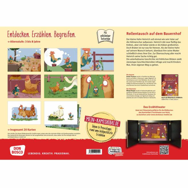 Hahn Heinrich soll in die Fußstapfen seines Vaters treten, eines Tages auf die gesamte Schar Hühner aufpassen und natürlich entsprechend krähen. Obwohl Klein-Heinrich ordentlich übt, überzeugt ihn diese Aufgabe so gar nicht. Viel lieber möchte er seiner Mutter beim Brüten helfen. Sein Wunsch löst zunächst erst einmal Unverständnis aus, denn einen brütenden Hahn hat es ja noch nie gegeben. Doch warum soll eigentlich ein Hahn kein guter Brüter sein? Heinrichs Mutter gibt ihm ein Ei. Wie Heinrich sich beim Brüten schlägt, warum Rollenklischees längst überholt sind und warum alle einfach tun sollten, womit sie sich wohlfühlen, erfahren Ihre Kinder im Kamishibai Erzähltheater.