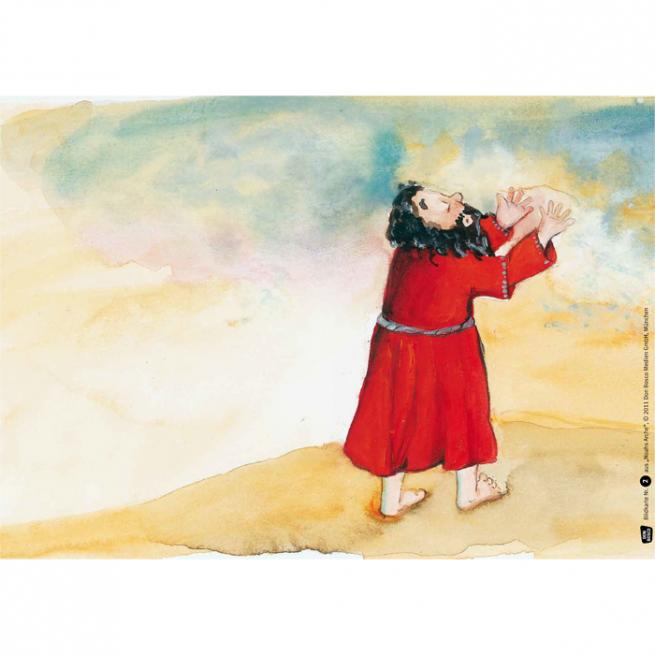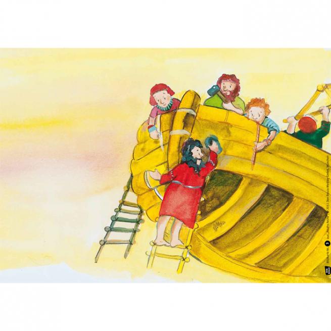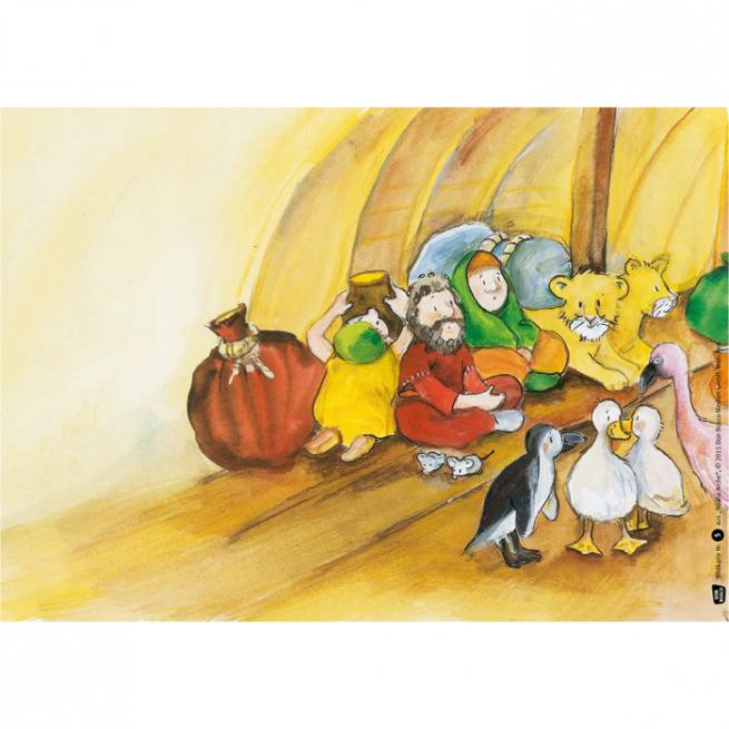 Aufbereitet fürs Erzähltheater Kamishibai erleben die Kinder mit jedem Bild, wie Noah die Arche baut, wer ihm hilft und wie ihm mit seiner Familie und sämtlichen Tieren die Reise in sichere Gefilde gelingt. Entstanden sind die Bildkarten nach Genesis 6 – 9.