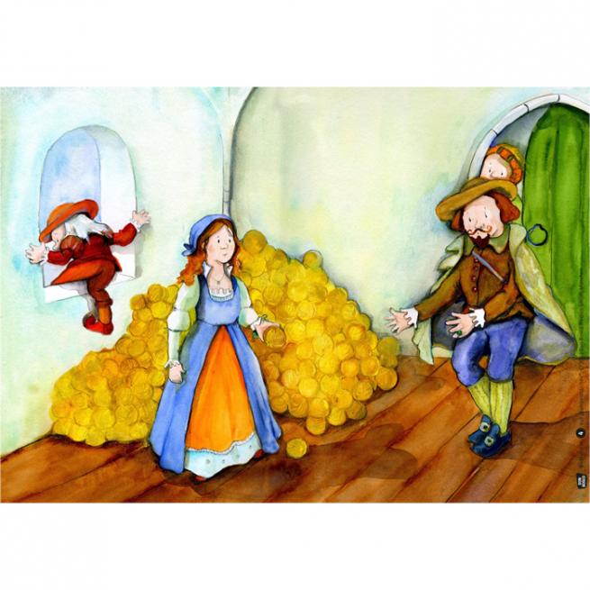 Jeder Zauber hat seinen Preis. Als ein Müller behauptet, seine schöne Tochter könne Stroh zu Gold spinnen, stellt der König sie auf die Probe. Verzweifelt nimmt das Mädchen des Nachts Hilfe von einem kleinen Männchen an. Es verwandelt das Stroh in Gold, nachdem das Mädchen ihm eine Kette gegeben hat. Der König ist begeistert und fordert noch mehr Gold. Wieder nimmt das Mädchen die Hilfe des Männchens in Anspruch. Doch auch seine Forderung steigert sich.
