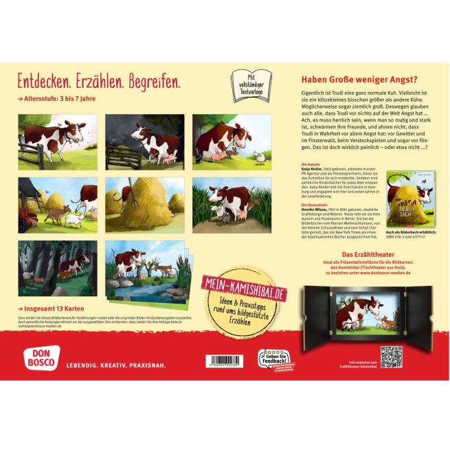 Weil die Kuh Trudi ganz schön groß ist, meinen ihre Freunde, dass sie supermutig und überhaupt nicht ängstlich ist. Das stimmt aber gar nicht, denn Trudi fürchtet sich sehr oft und ist ein wahrer Angsthase. Um ihre Freunde nicht zu verunsichern, zeigt sie ihre Angst nicht und tut nur so, als sei sie mutig. Da dies aber auf Dauer nicht so weitergehen kann, vertraut sie sich schlussendlich ihren Freunden an. Wie diese Trudi aufmuntern und ermutigen und warum es so wichtig ist, darüber zu reden, wie man sich fühlt, erfahren Ihre Kinder im Erzähltheater Kamishibai.