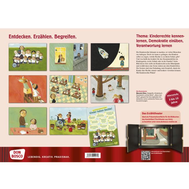 Wissen Ihre Kinder eigentlich, dass sie Rechte haben, wie sie sie nutzen und was das fürs Zusammenleben im Kindergarten, der Schule und zu Hause bedeutet? Im Erzähltheater Kamishibai stellt jede einzelne dieser Bildkarten ein Kinderrecht in den Mittelpunkt. Dazu zeigen die Karten jeweils ein Erlebnis mitten aus dem Kinderleben. Situativ anschaulich und mit Gesprächsanlass verstehen die Kinder so ihre Rechte. Kinderrechte-Plakat inklusive.