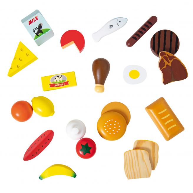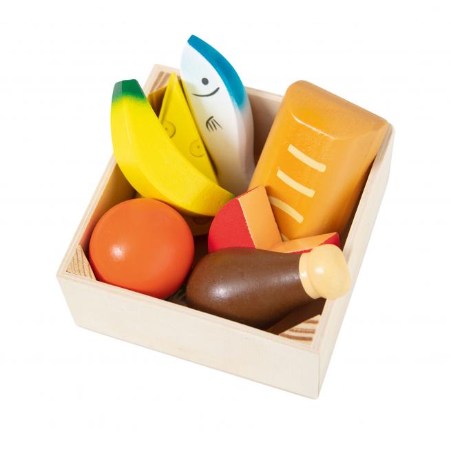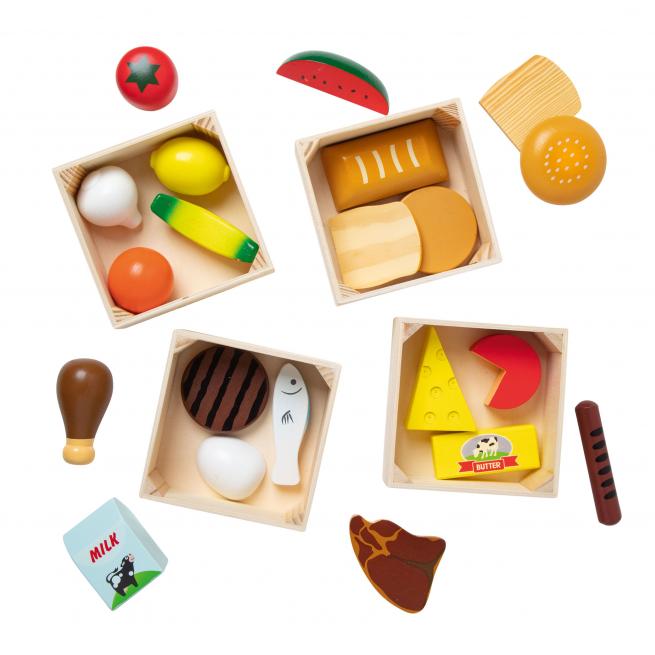 Wareneingang für den Kaufladen: Die 4 Holzkisten sind gefüllt mit Milchprodukten, Brot, Fleisch und Gemüse. Beim Sortieren, Zählen und Einräumen in ihren Laden lernen die Kinder, dass es verschiedene Lebensmittelgruppen gibt. Massivholz und handliche Größe bescheren lange Spielfreude. Auch super für die Spielküche.