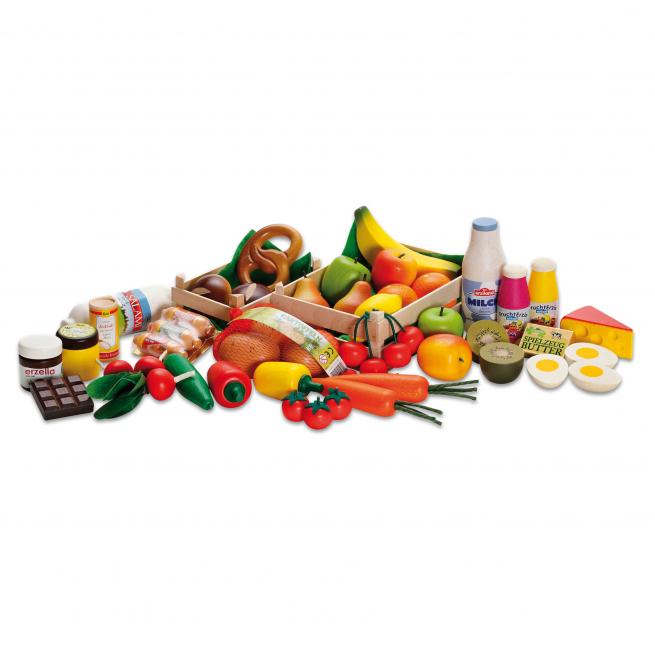 Einkaufen wie die Großen gelingt Ihren Kindern mit dem 43-teiligen Sortiment für ihren Kaufladen. Die Lebensmittel sind wirklichkeitsgetreu gestaltet und bestehen aus handschmeichelndem, bruchsicherem Buchenholz. In den beiden Obststiegen präsentieren die kleinen Kaufleute ihre Waren optimal oder sortieren sie nach Warengruppen. Beim Einkaufen oder im Gespräch mit ihren Kunden unterhalten sie sich über ihr Lieblingsessen und erweitern so spielend ihren Wortschatz.