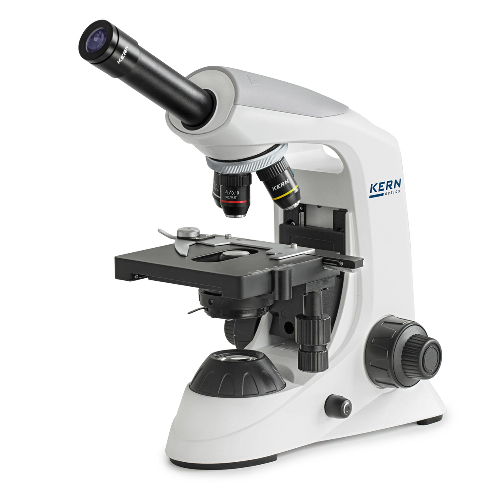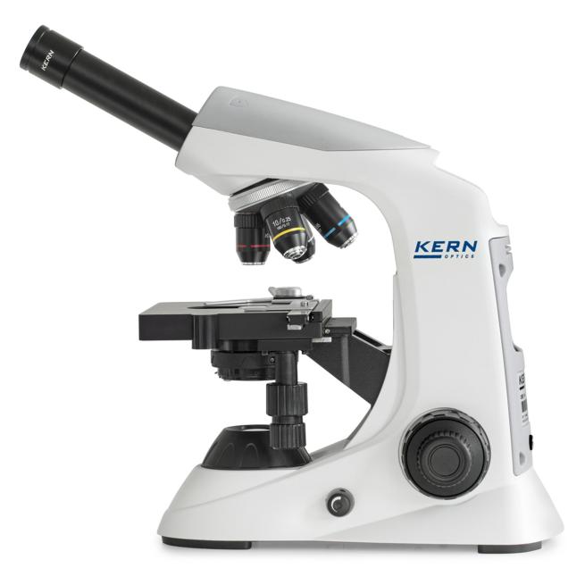 • 1 OBE-121-Durchlichtmikroskop von KERN in monokularer Bauweise (inklusive 3 vormontierter Objektive für 4-, 10- und 40-fache Vergrößerung, inklusive 1,25-Abbe-Kondensor)