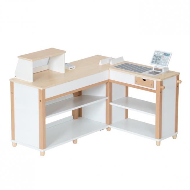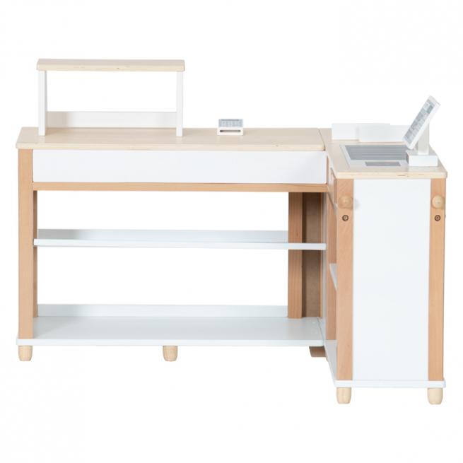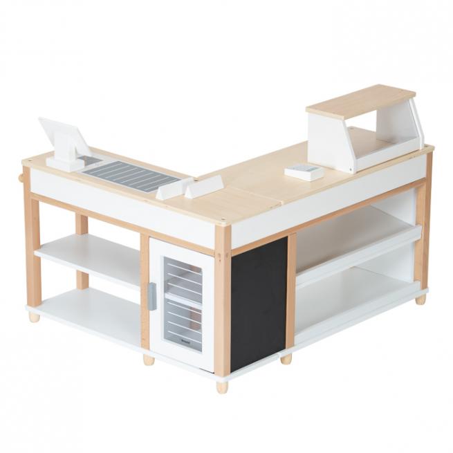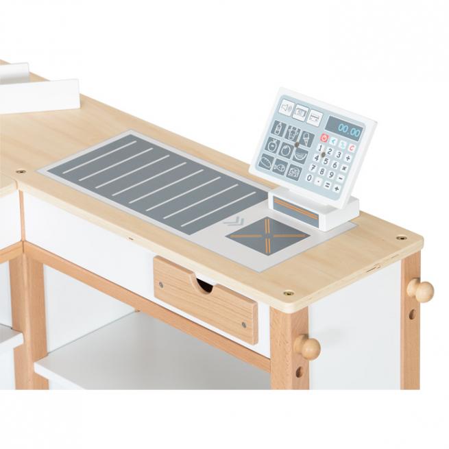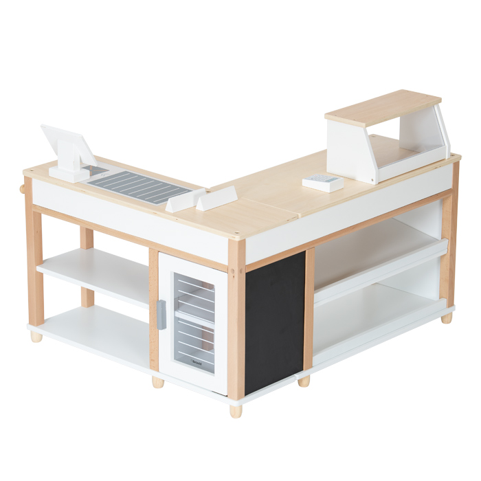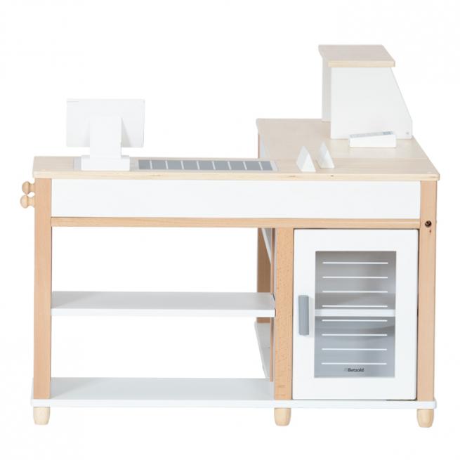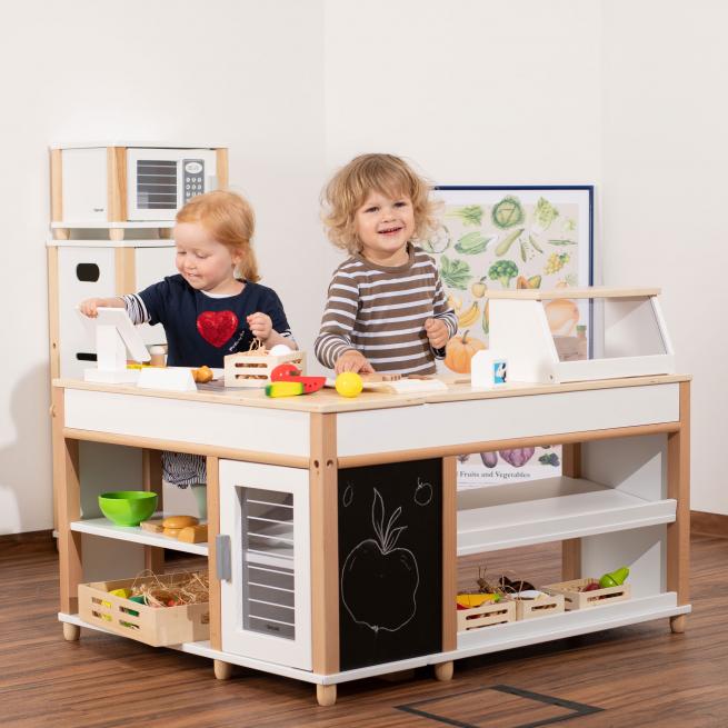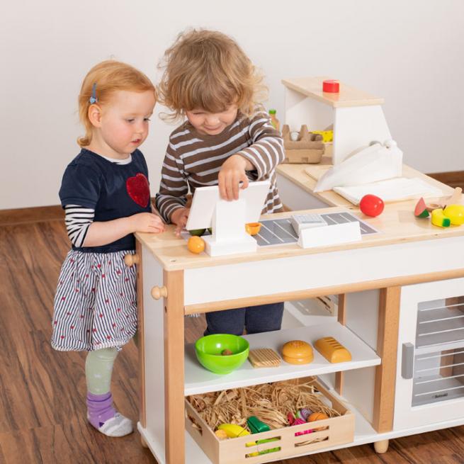 Ihre kleinen Shopper nehmen sich die Einkäufe aus den Regalen und dem „Kühlschrank“, legen alles samt Warentrenner auf das „Förderband“ und zahlen an der schicken „Computerkasse“ dank „Kartenlesegerät“ sogar bargeldlos.