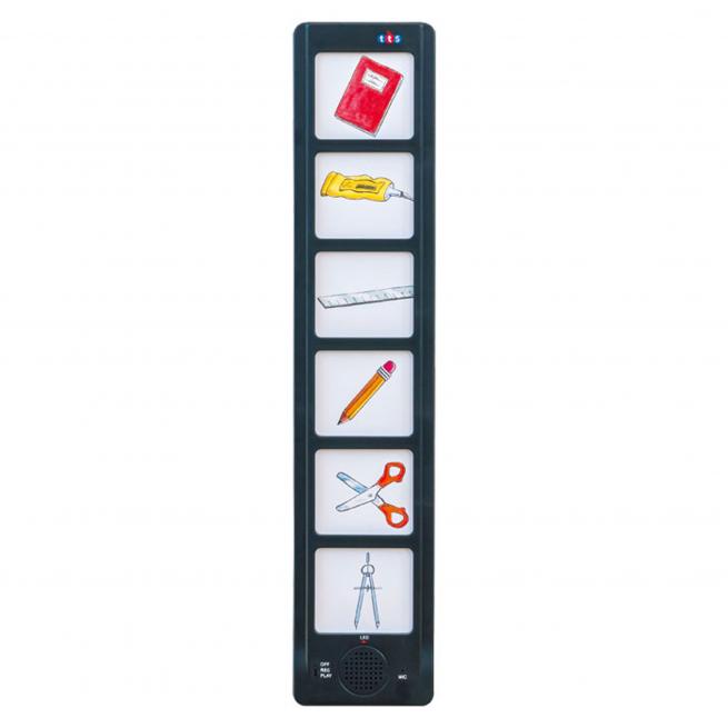 Bilderrahmen mit Sprachfunktion. In jedes der 6 Felder schieben Sie Karten mit Fotos, Bildern, Wörtern oder Zahlen und versehen sie mit bis zu 10 Sekunden Text.