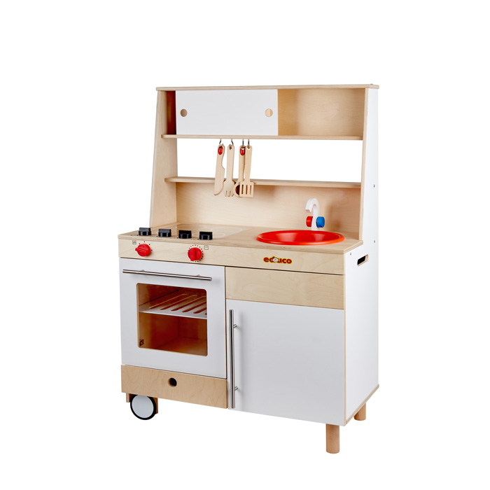 Den kompakten Küchenblock mit Backofen, Kochplatten, Spüle, Wasserhahn und Schrank bespielen kleine Hobbyköche wie eine reale Küche. Rührlöffel, Pfannenwender, Messer und Gabel helfen beim Zubereiten köstlicher Speisen. Soundeffekte am Herd unterstreichen das Kocherlebnis. Der Schrank unter der Spüle sowie die Schublade unter dem Backofen und das obere Regal mit Schiebetür bieten viel Stauraum für Kochutensilien (bitte separat bestellen).