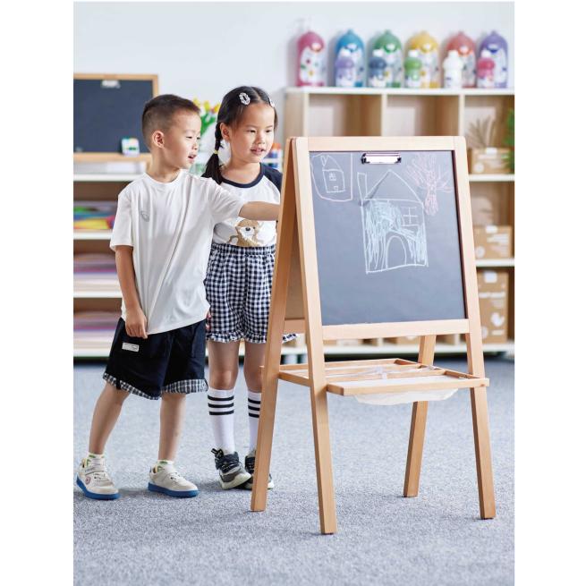 Die 2-in-1 Kinderstaffelei ist beidseitig magnetisch und verfügt sowohl über eine Kreidetafel als auch über eine Whiteboard-Seite. Das bietet nicht nur Abwechslung, sondern auch die Möglichkeit für mehrere Kinder gleichzeitig zu malen und schreiben. Im praktischen Ablagefach können sie Kreide und Stifte aufbewahren.