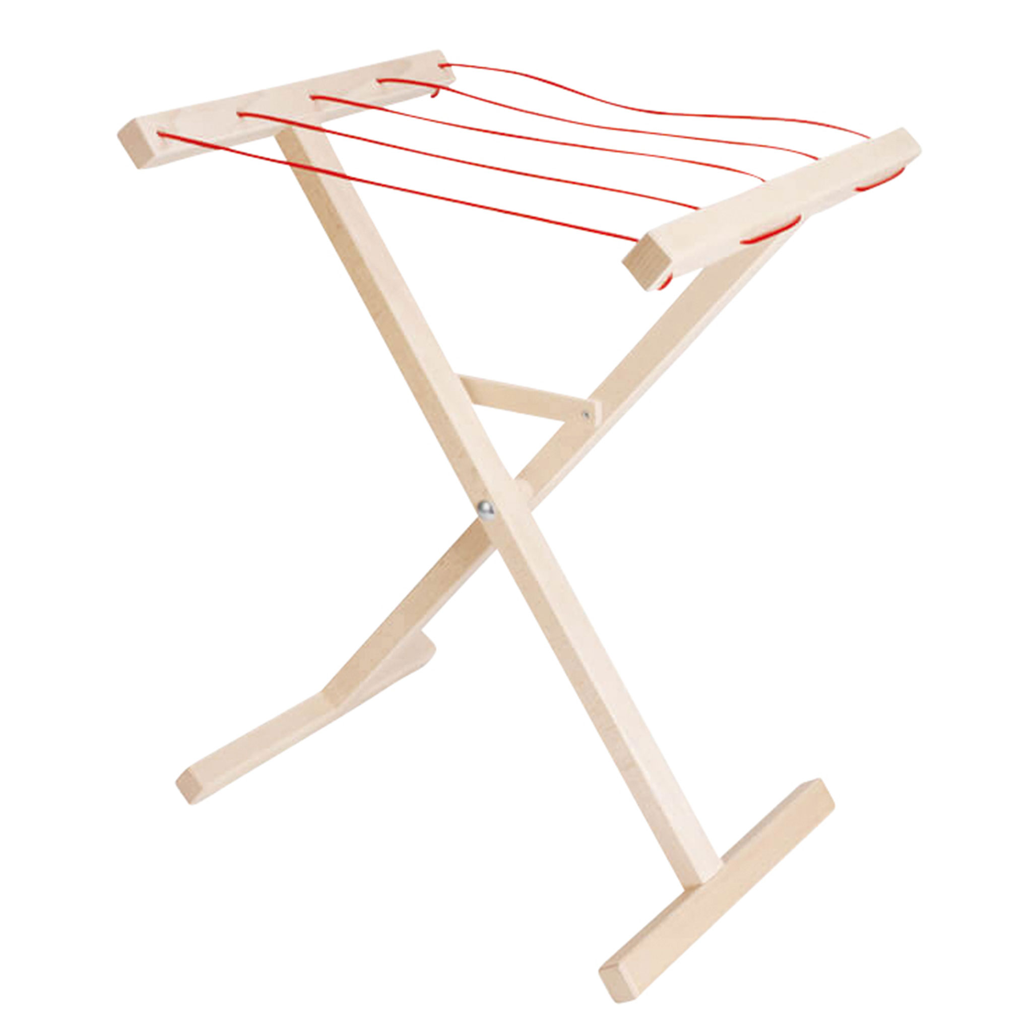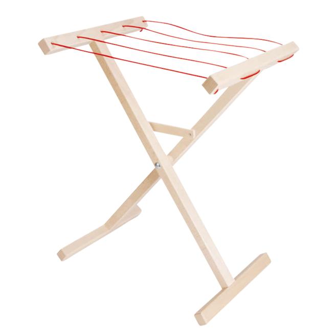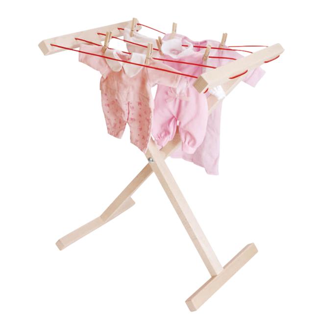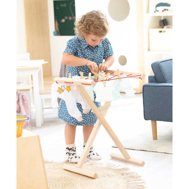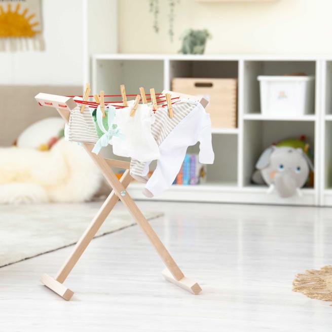 Haushaltshelfer für den Puppenhaushalt im Rollenspiel. Auf dem Buchenholz-Wäscheständer hängen Puppenkleidchen, Hosen, Pullis und Co. ordentlich und „trocknen“ bestens. Wer den Wäscheständer nicht mehr benötigt, klappt ihn zusammen und lagert ihn platzsparend. Optimal, um die Haushaltsroutinen der Großen nachzuahmen.