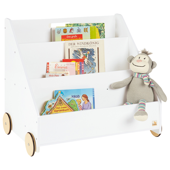 Dieses schöne Bücherregal bietet reichlich Platz für die Lieblingsbücher Ihrer Kinder in 3 stufenförmig angeordneten Fächern. So sind alle Bücher gut zu sehen. In praktischer Kinderhöhe können die Kleinen ganz leicht selbst auf Ihre Bibliothek zugreifen. Auf der Rückseite versteckt sich noch ein Geheimfach. Dank der gummierten Holzräder können Sie das Regal unkompliziert in Ihren Räumen verschieben. Erhältlich in Weiß oder Grau. Einfache Selbstmontage.