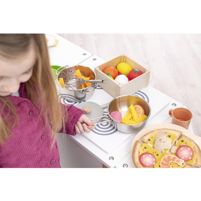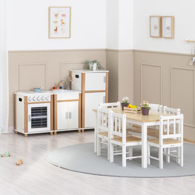 Die Elemente der Kinderküche ordnen Sie individuell an und passen sie so einfach an den verfügbaren Platz an. Drehbare Bedienknöpfe an Herd und Backofen sowie das herausnehmbare Spülbecken bieten ein realistisches Spielerlebnis. Die stabile Holzkonstruktion hält auch intensiven Spielphasen stand – ideal für den täglichen Einsatz in Kitas.