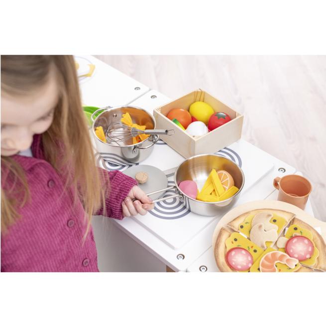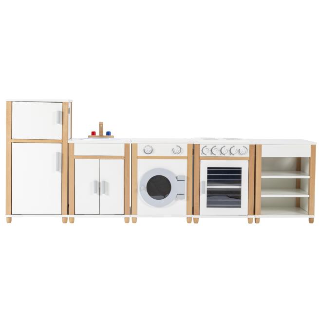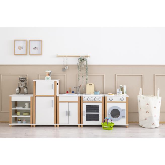 Kochen wie die Großen. In der Kinderküche entdecken kleine Küchenprofis die Welt des Kochens und Backens. Neben Herd, Backofen, Kühlschrank, Spülbecken und Waschmaschine bietet sie ein großzügiges Küchen-Block-Regal. Darin finden Kochutensilien, Kochtöpfe & Pfannen sowie Spiel-Nahrungsmittel (nicht enthalten) Platz – und es bleibt noch genug Arbeitsfläche für fantasievolle Koch- und Backkreationen.