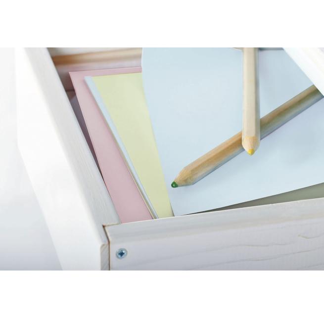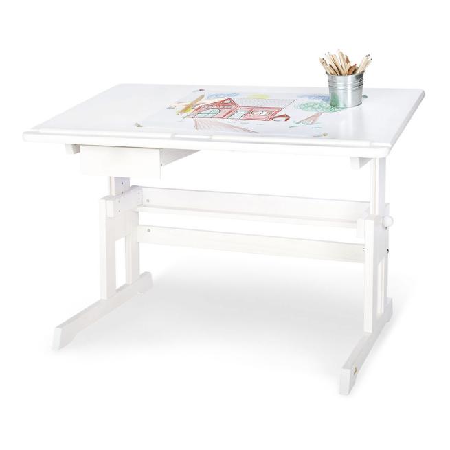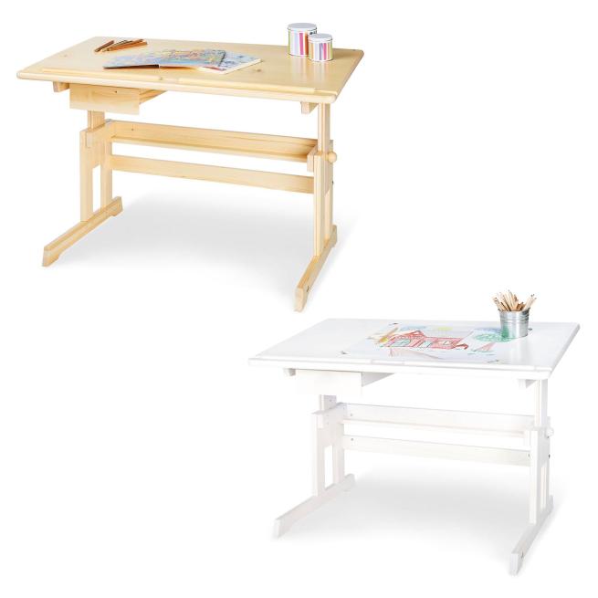Der stabile Kinderschreibtisch Lena ist der optimale Arbeitsplatz für viele Schuljahre. Der Schreibtisch ist klar lackiert mit gut erkennbarer Kiefernholzmaserung oder weiß lasiert erhältlich. Praktischerweise wächst er mit, denn von 57 bis 70 cm verstellen Sie ihn ganz einfach 5-fach in der Höhe. Die Tischplatte ist bis zu 55° neigbar, was beim Malen oder bei sehr präzisen Arbeiten überaus hilfreich ist. Den Schubkasten montieren Sie ganz nach Wunsch entweder an der linken oder rechten Unterseite des Schreibtisches. Stifte und Arbeitsutensilien finden darin Platz. Zur einfachen Selbstmontage.