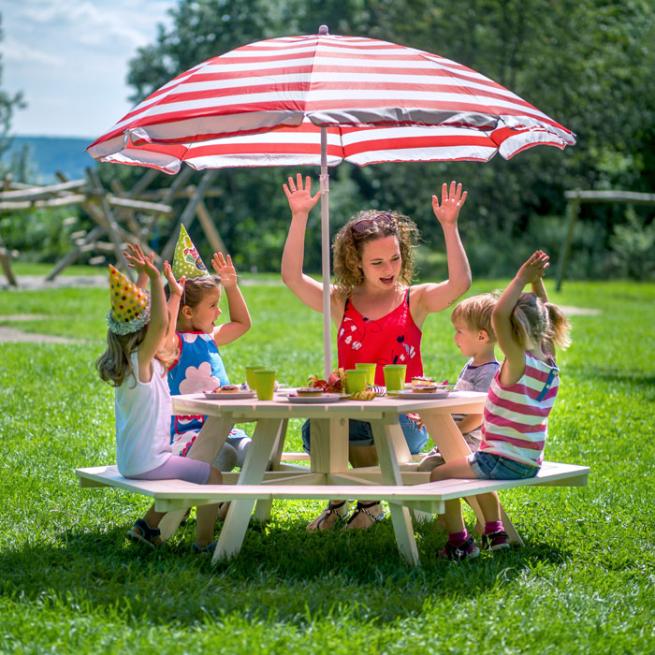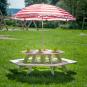 Hier sitzt eine fröhliche Runde zusammen. Die 6 Bänke sind fest mit dem Tisch verbunden. In die Aussparung in der Mitte stecken Sie z. B. einen Sonnenschirm (nicht im Lieferumfang enthalten). Zur Selbstmontage. Inklusive Montagematerial und Aufbauanleitung.