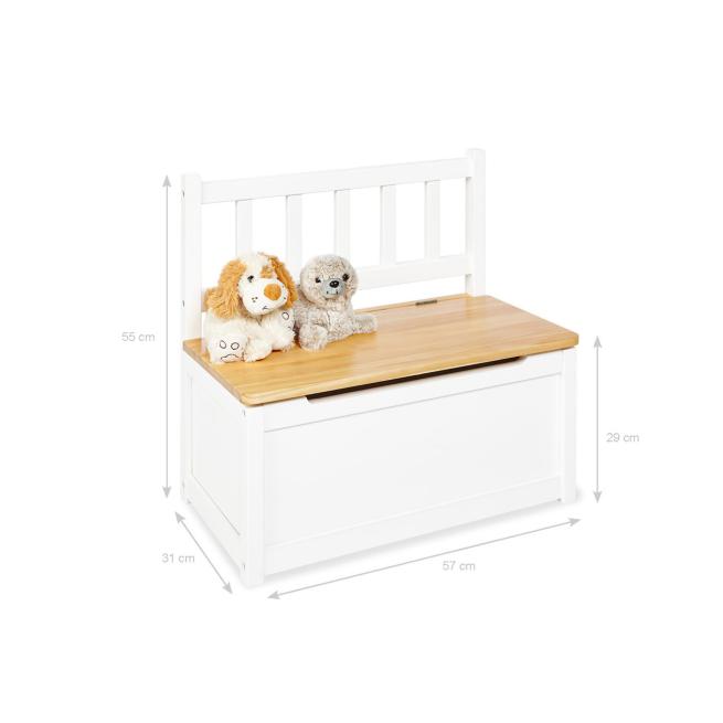 Mit der Truhenbank schaffen Sie zusätzlichen Platz zum Sitzen. Gleichzeitig verschwindet Spielmaterial, Bücher oder Bastelzubehör ordentlich im Inneren der Bank. So bleibt der Raum aufgeräumt, ohne dass etwas aus dem Blick gerät. Deckel mit Klappendämpfer.