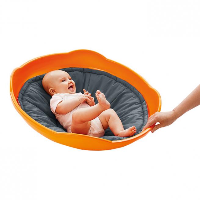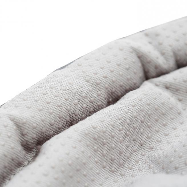 Weiches, graues Kissen, auf dem Babys und Kleinkinder sicher und komfortabel im Kreisel liegen. Wattierter Stoff mit gummierten Punkten auf der Unterseite, damit das Kissen nicht verrutscht.