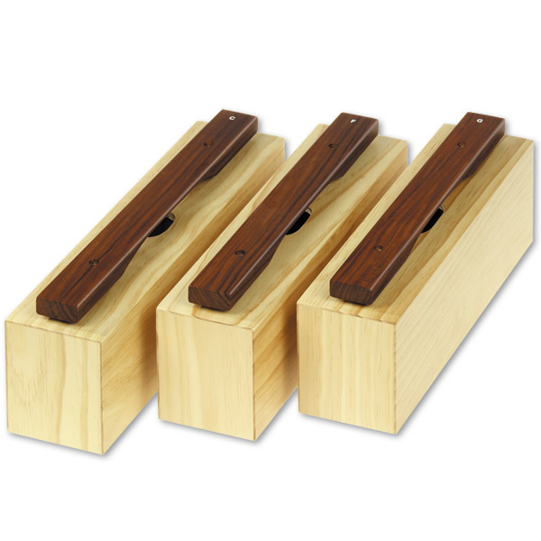 Mit dem Resonanzkörper aus Kiefernholz und den Klangplatten aus Pau Rosa-Holz lassen die Bass-Klangbausteine den typisch warmen Xylophon-Klang entstehen. Das Set ist wahlweise mit 3 oder 4 Klangbausteinen erhältlich.
