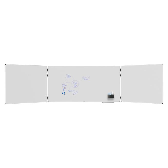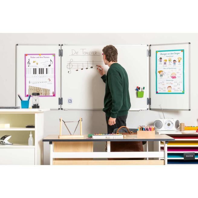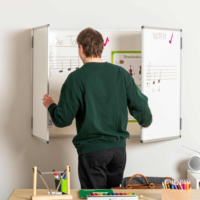 Dieses klappbare Whiteboard bringt Übersicht an die Wand und schafft viel Platz für Ideen, Notizen und Lerninhalte. Zwei doppelseitige Klappflügel erweitern die Fläche im Handumdrehen und unterstützen einen klar gegliederten Aufbau von Themen. So haben Sie auf 5 magnetischen, beschreibbaren Tafelflächen reichlich Platz für Tafelbilder, Wochenpläne, Gruppenaufgaben oder Präsentationen. Die Oberflächen sind trocken abwischbar, kratzfest und für den täglichen Einsatz in Klassenzimmern, Besprechungsräumen und Gruppenräumen ausgelegt. Eine 30 cm lange Markerablage gehört zu jeder Ausführung. Zur Wandwandmontage, inklusive Befestigungsmaterial und Anleitung. Einfache Selbstmontage.