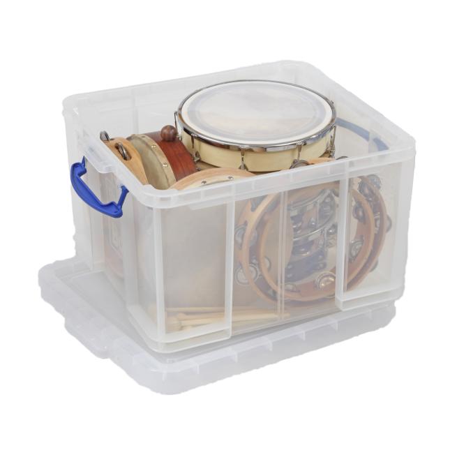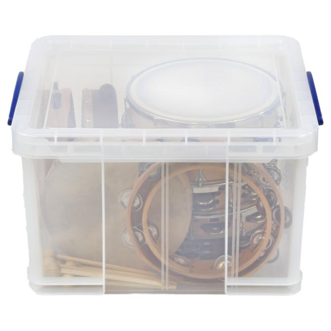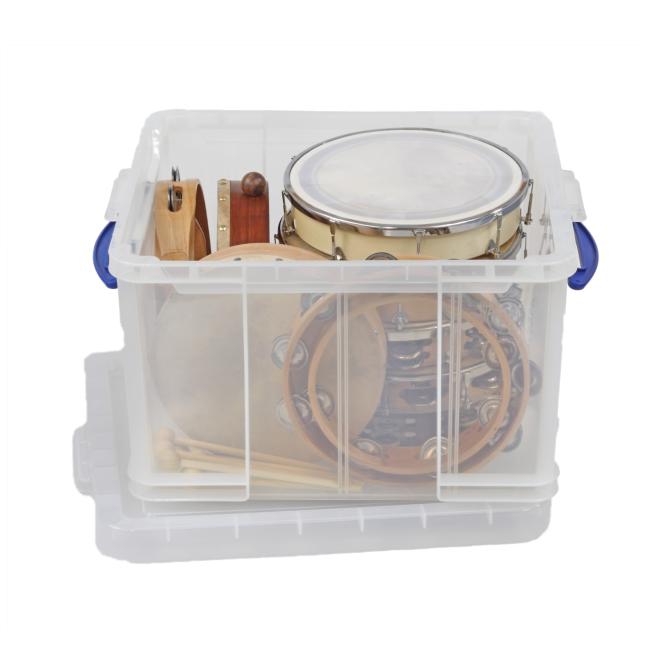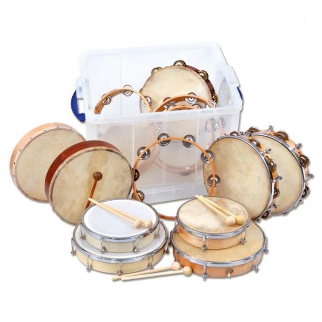 6 Rahmentrommeln, 4 Schellenringe, 4 Tamburine dazu 1 Aufbewahrungsbox aus transparentem Kunststoff mit Tragegriffen.