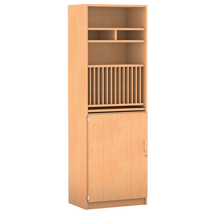 Tadellose Ordnung. In diesem abschließbaren Schrank mit vollständig ausziehbarer Schreibplatte verstauen Sie Formulare und insbesondere Klassenbücher. Dank des variabel positionierbaren Einsatzes mit einer Fächerbreite von 37 x 2,7 x 21,5 cm rutschen die Klassenbücher nicht hinten hinunter. Der Einsatz für Formulare kann ebenfalls individuell eingesetzt werden und hat eine Höhe von 11,5 cm. Die praktische Schreibplatte mit einer Tragfähigkeit von 35 kg befindet sich auf der angenehmen Höhe von 102,6 cm. Das verschließbare Schrankteil darunter bietet ausreichend Stauraum für sämtliche Büroutensilien.