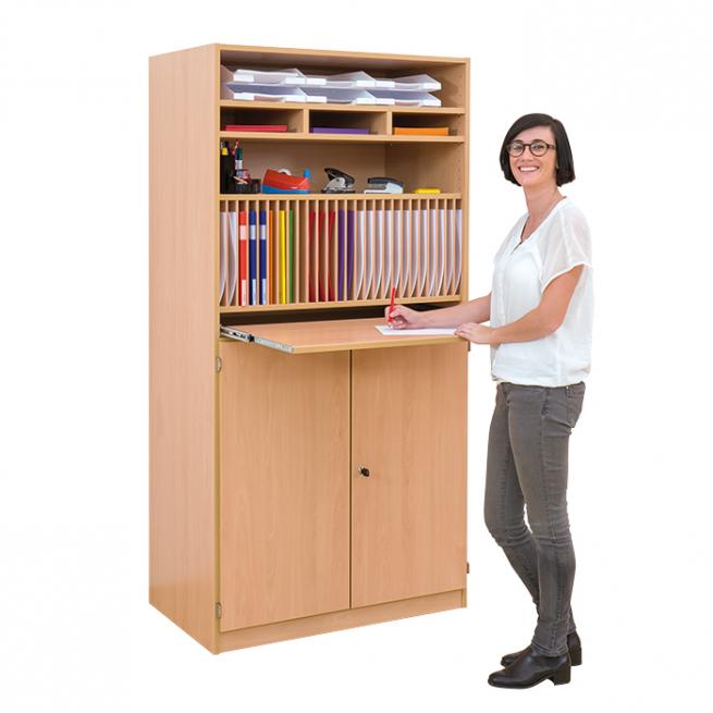 Tadellose Ordnung. In diesem abschließbaren Schrank mit vollständig ausziehbarer Schreibplatte verstauen Sie Formulare und insbesondere Klassenbücher. Dank des variabel positionierbaren Einsatzes mit einer Fächerbreite von 37 x 2,7 x 21,5 cm rutschen die Klassenbücher nicht hinten hinunter. Der Einsatz für Formulare kann ebenfalls individuell eingesetzt werden und hat eine Höhe von 11,5 cm. Die praktische Schreibplatte mit einer Tragfähigkeit von 35 kg befindet sich auf der angenehmen Höhe von 102,6 cm. Das verschließbare Schrankteil darunter bietet ausreichend Stauraum für sämtliche Büroutensilien.