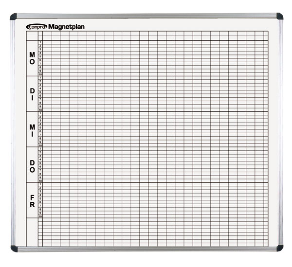 Jede Zeile steht für eine Unterrichtsstunde. Die Zeilen sind daher für jeden Tag von 1-10 beschriftet.Für jede Lehrperson sollte ein Satz Magnetsymbole zur Verfügung stehen. Jeder Satz Magnete hat eine andere Farbe oder ist mit einem anderen Symbol beklebt. So ist jeder Magnet schnell einem bestimmten Lehrer zuzuordnen.