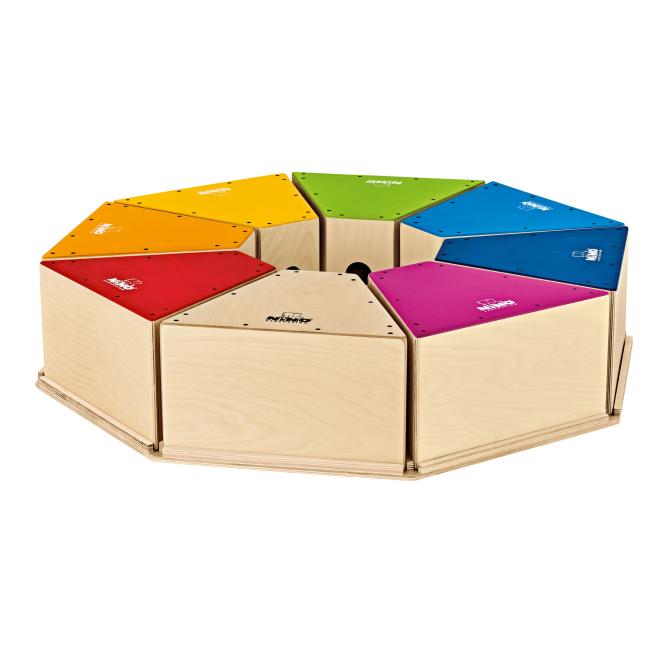 Trommel-Teamwork in großer Runde. Entdecken Sie gemeinsam mit Ihren SuS, wie sie zusammen erste Rhythmen und Takte spielen. Die 8 Cajons mit den Oberseiten in 8 starken Farben platzieren Sie auf der Holzplatte. Einzelne Leisten halten die Instrumente auf der Platte, sodass sie beim Bespielen festen Halt haben. Edles Birkenholz und die nach vorn gerichteten Schallöffnungen bieten volle Resonanz und einen frei schwingenden Klang. Zum Lagern einfach die Cajons von der Platte nehmen und stapeln. Ab 3 Jahren.