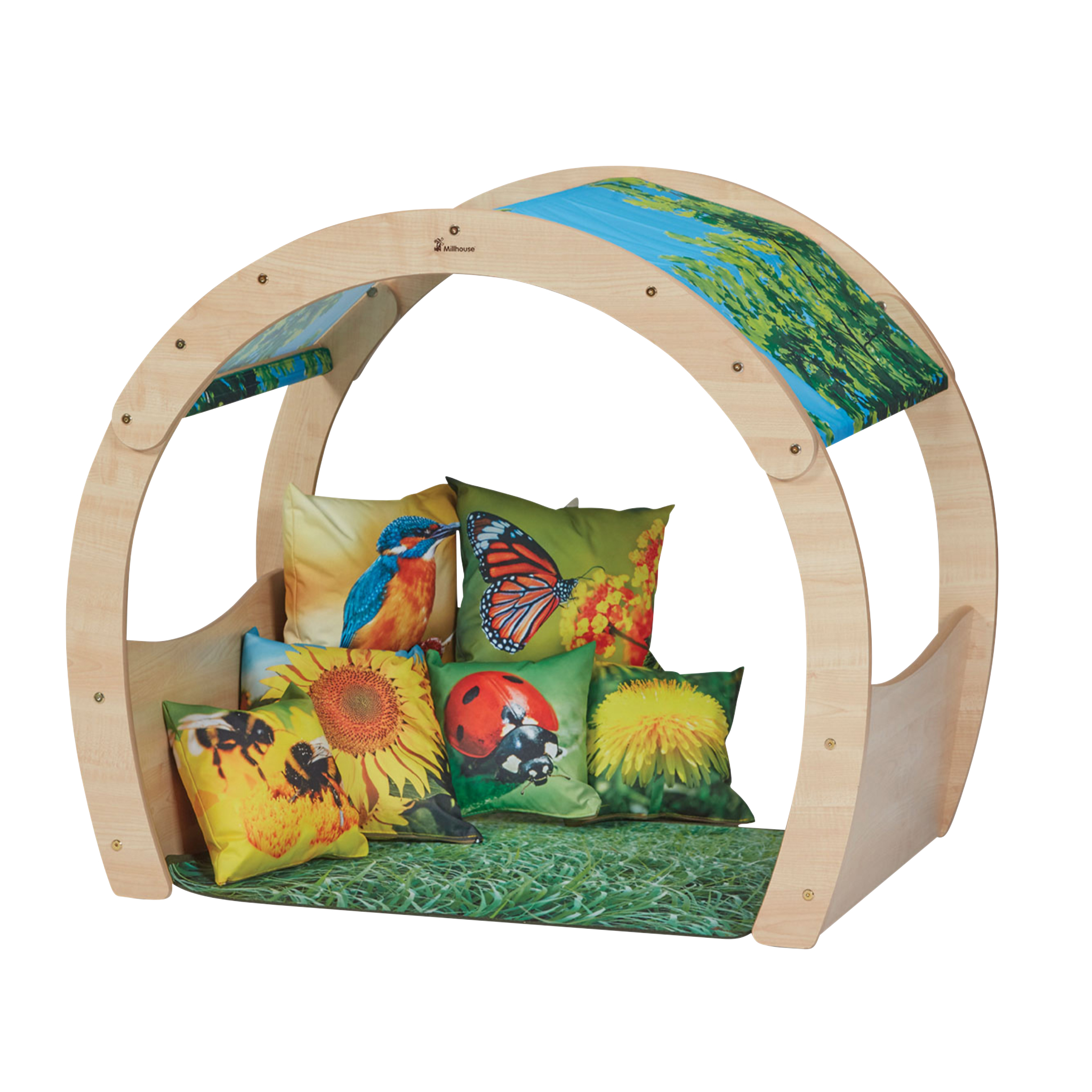 Kissenbezüge und Dachabdeckung sind waschbar bei 60 °C. Die strapazierfähige Soft-Touch-Matte ist feucht abwischbar und mit einer Gummi-Unterseite ausgestattet, damit beim Spielen nichts verrutscht. Einfache Selbstmontage.