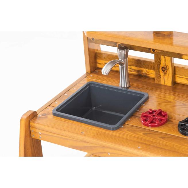 Das strapazierfähige Spülbecken aus Polypropylen besitzt einen funktionsfähigen Edelstahl-Wasserhahn samt Gartenschlauchanschluss für heiteren Spülspaß mit echtem Wasser. Schließen Sie mit wenigen Handgriffen Ihren Gartenschlauch an und sorgen Sie für eine flüssige Versorgung mit dem kühlen Nass – so ist das Spielzeuggeschirr im Nu blitzblank wie nie!Die 2 simulierten Kochplatten aus robustem ABS-Kunststoff sind ebenfalls eine runde Sache und halten der Witterung sowie dem eifrigen Spiel der Kinder mühelos stand. Auf dem praktischen Ablageregal verstauen die Kinder dabei ihre Kochutensilien (Zubehör nicht im Lieferumfang), größere Objekte finden auf der unterseitigen Abstellfläche einen passenden Platz.