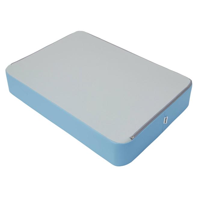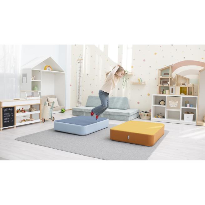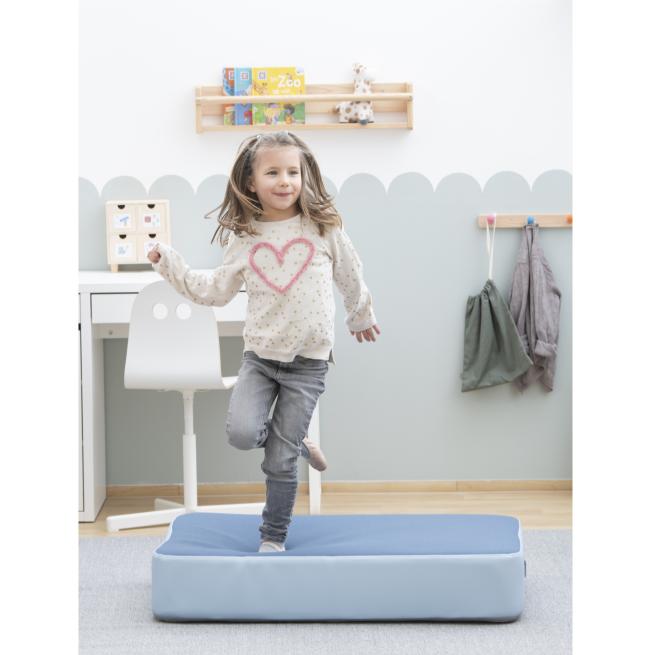 Multifunktionales Hüpfpolster, das alles bietet, was man will: Es ist angenehm weich, besitzt eine den kindlichen Bewegungsapparat schonende Federung (Stahlfederkern) und ist mit einem bequemen Textil- und Kunstlederbezug versehen. Die Kinder nutzen das Polster zum ausgiebigen und altersgerechten Springen oder zum entspannten Ausruhen. Die rutschfeste Unterseite aus Turnmattenstoff sorgt dabei stets für sichere Bodenhaftung. Dank kompakter Maße von 97 x 70 x 17 cm (L x B x H) findet das Hüpfpolster nahezu überall seinen Platz.